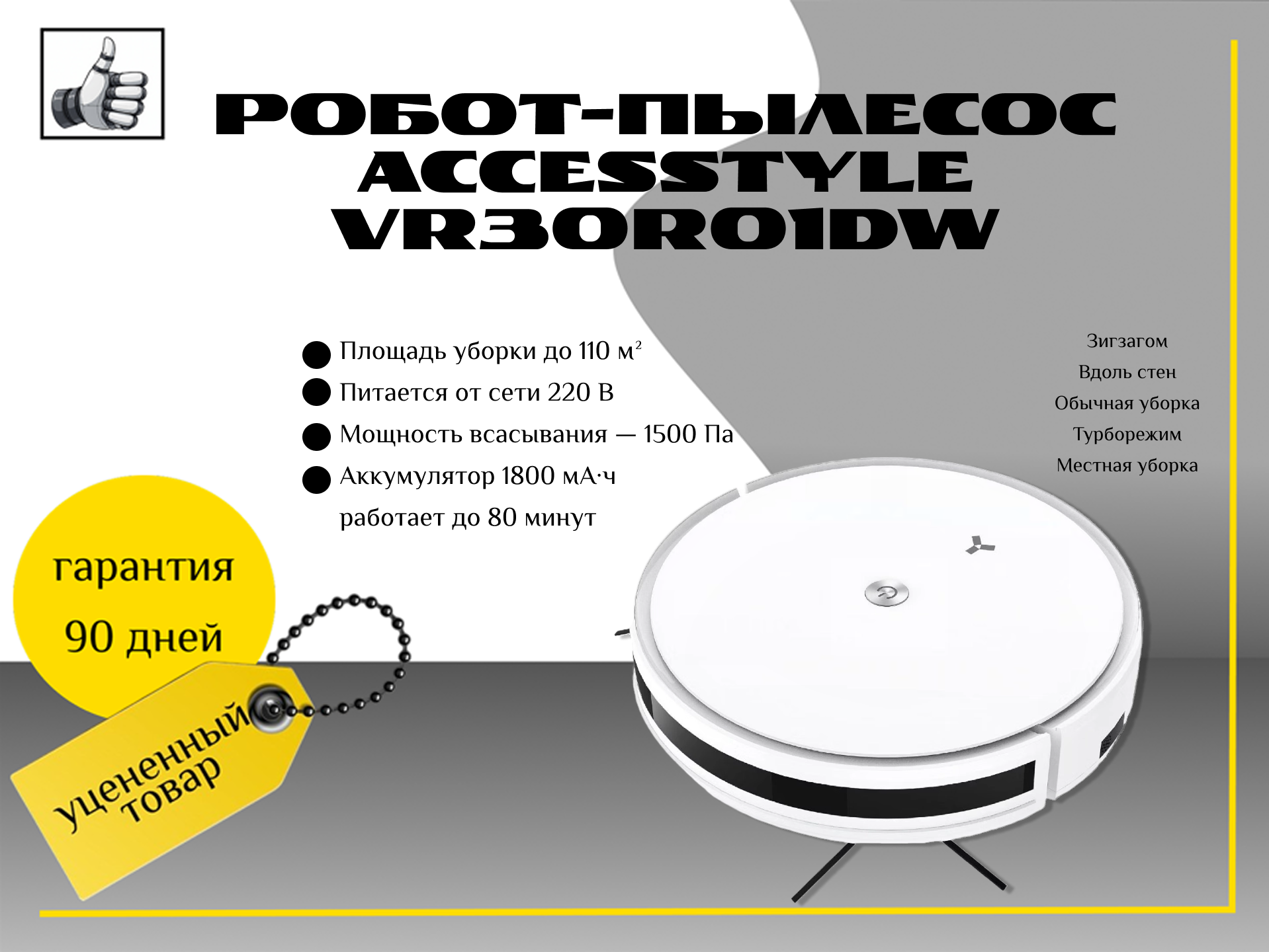 Робот-пылесос Accesstyle VR30R01DW с аккумулятором 1800 мА·ч работает до 80 минут. Одного заряда хватает на уборку 110 м². Автоматически возвращается на док-станцию за 5 часов. Питается от сети 220 В.