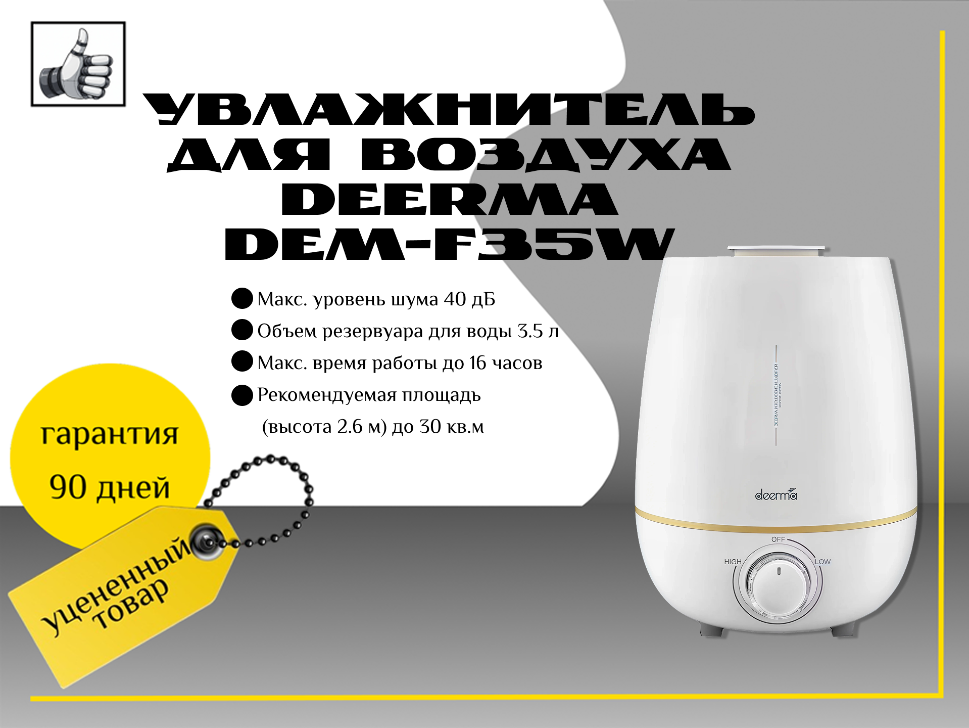 Воздухоувлажнитель Deerma DEM-F35W белого цвета рекомендуется использовать в помещении площадью не более 30 м². Объем резервуара — 3,5 л. Уровень шума не превышает 40 дБ. Габариты модели — 26,2х21,5х20,4 см. Вес изделия — 1,04 кг. Устройство может работать до 16 часов без перерыва. Мощность можно выставлять вручную с помощью поворотной ручки. Прибор автоматически отключается при отсутствии воды. Способ установки — напольный или настольный. Устойчивые ножки не скользят по поверхности. Корпус и бак сделаны из прочного гигиеничного пластика.