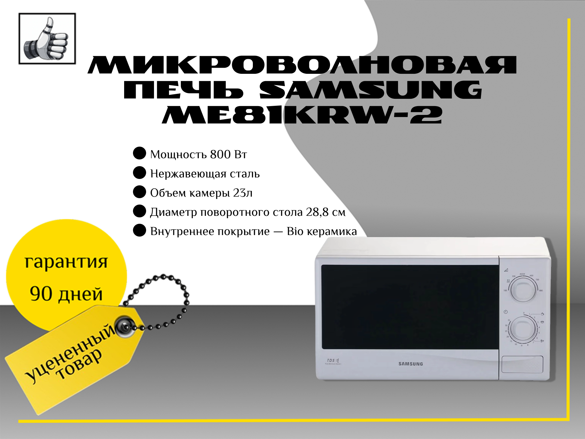 Микроволновая печь мощностью 800 Вт оснащена механическим управлением. Внутреннее покрытие выполнено из биокерамики, а дверца открывается с помощью клавиши. Диаметр поворотного стола составляет 28,8 см, а сама дверца открывается налево.