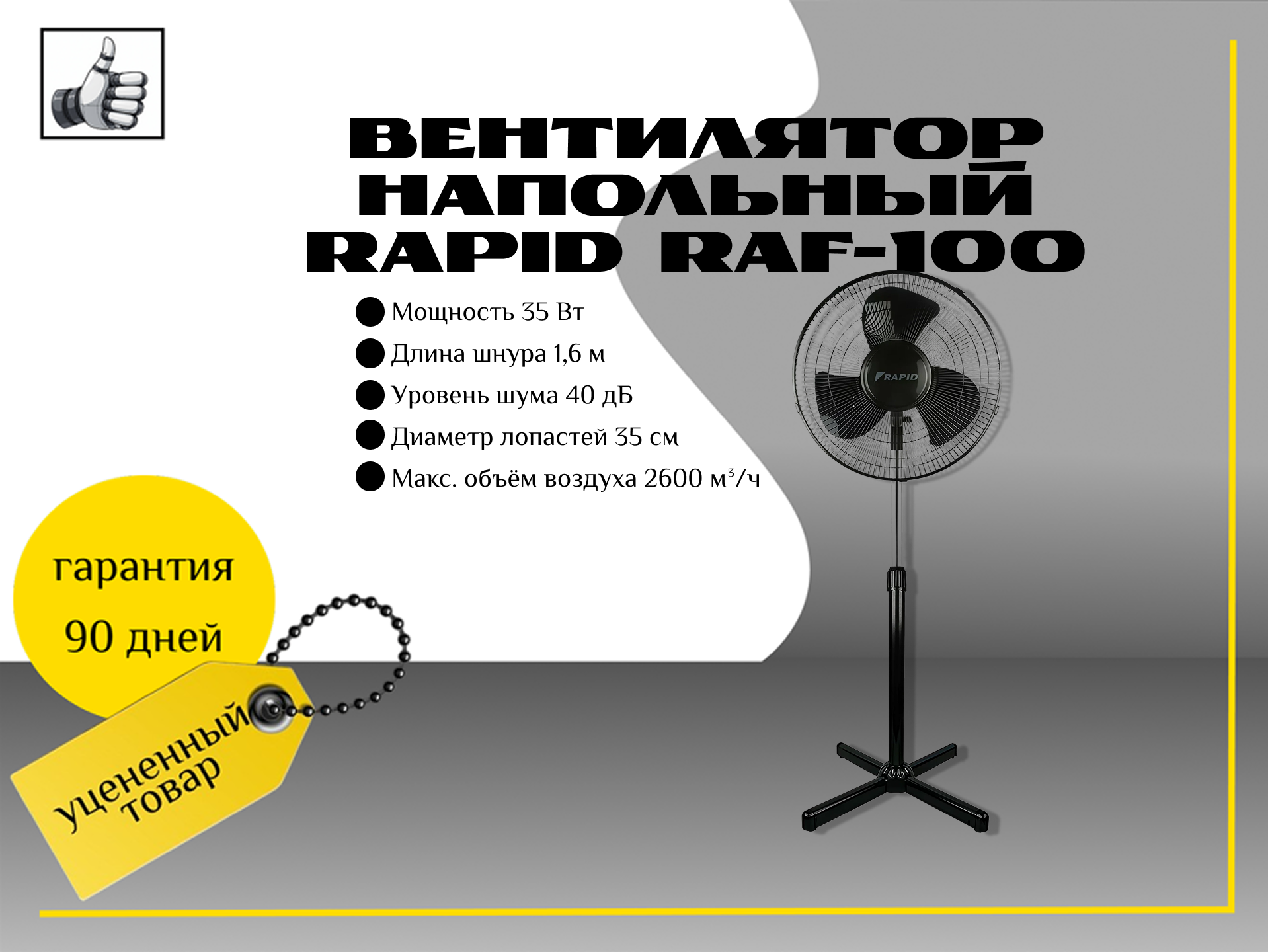 Вентилятор напольный Rapid RAF-100 в чёрном цвете — это бытовое устройство с механическим управлением и тремя скоростями работы.