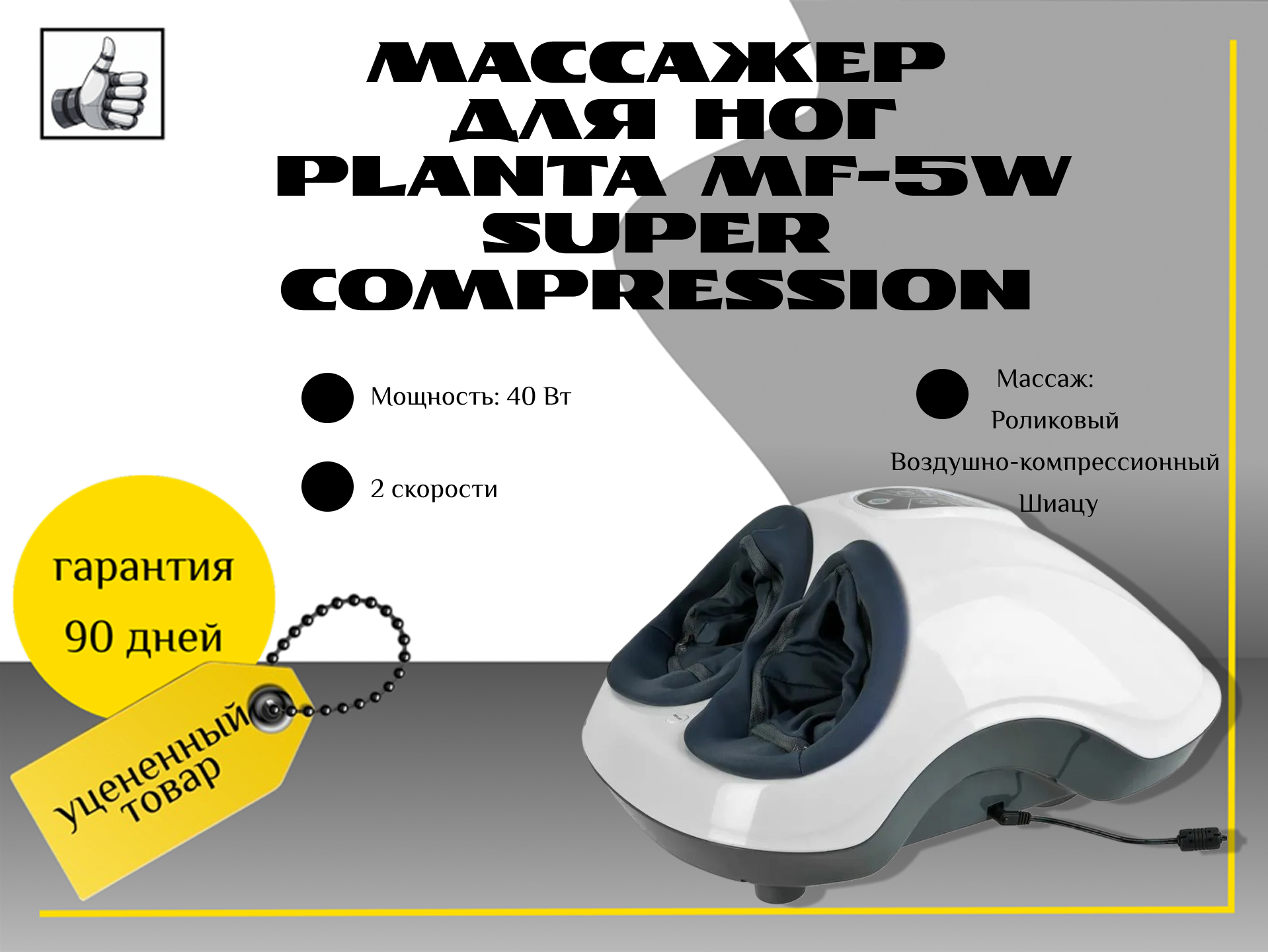 Массажёр для ног Planta MF-5W Super Compression снабжён роликами, воздействующими на биологически активные участки ступней. Он улучшает самочувствие, снимает усталость, уменьшает уровень стресса и ускоряет процессы обмена веществ. Компрессионная система значительно повышает его эффективность по сравнению с другими моделями.