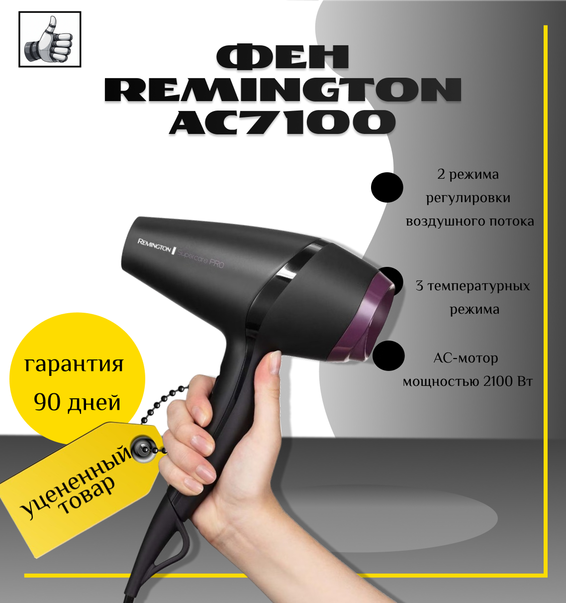 Фен Remington AC7100 — это лёгкое и компактное устройство, которое быстро сушит волосы, обеспечивая бережный нагрев. Функция «Холодный воздух» помогает зафиксировать укладку.